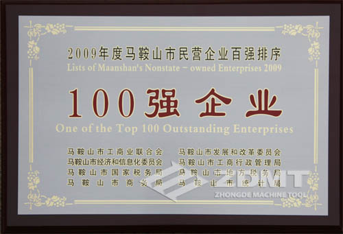 由市工商联、市发改委、经信委、工商局、国税局、地税局、商务局、统计局配合构造展开的马鞍山市2009年度民营企业百强排序勾当发表。中德机床公司榜上着名,排列“2009年度马鞍山市民营企业停业支出100强”第70位、“2009年度马鞍山市民营企业征税总额100强”第87位。