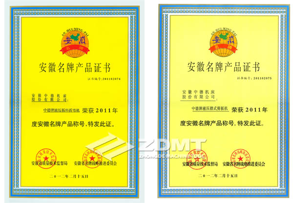 2012年3月22日,马鞍山市召开了全市品质手艺监视任务集会,集会对2011年取得质监部分相干声誉的企业与小我停止了惩处,我公司中德牌液压油泵摆式液压剪板机和中德牌气动板料折弯加工机两个产物别离经由过程了2011年“安徽名牌”的复审。
